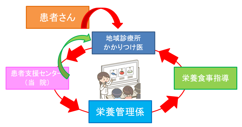 - 当院では地域の方々の食生活を支援していくために、外来栄養食事指導を行っています。栄養食事指導を受けていただくには、かかりつけ医からのご依頼が必要ですので、ご希望の際は、かかりつけ医にその旨を伝えてください。